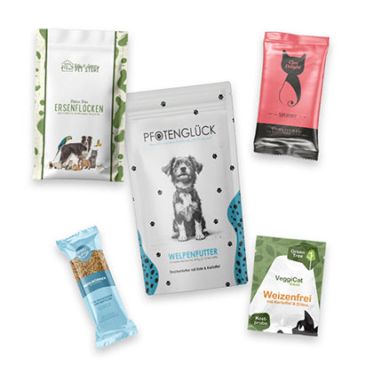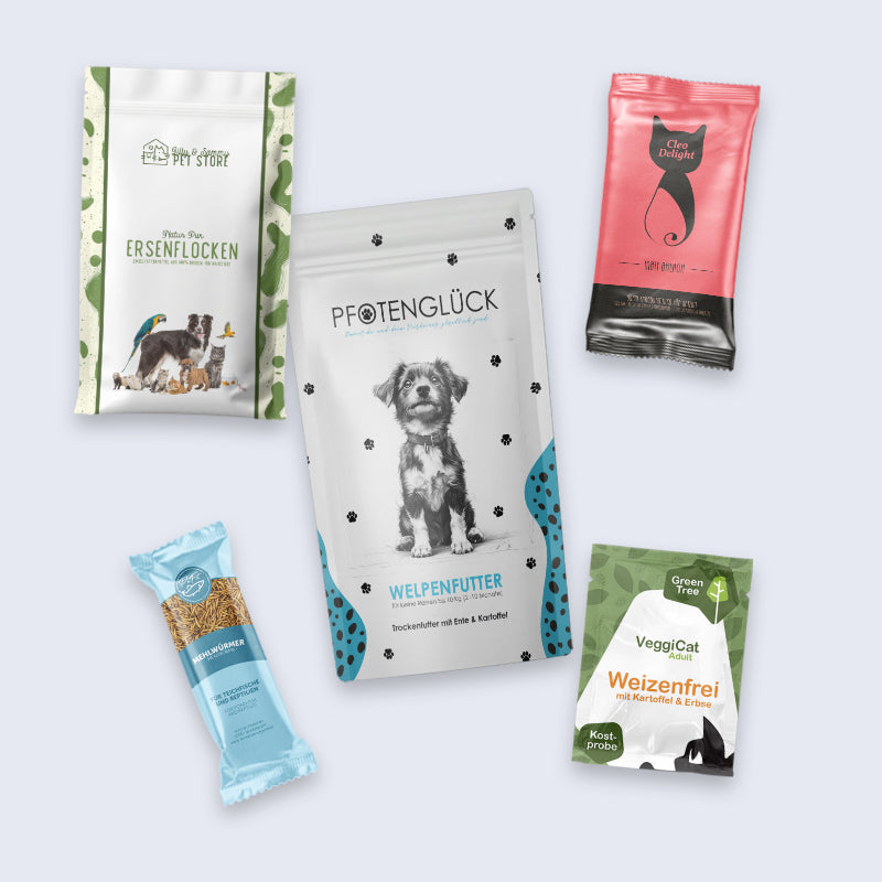Effektiver Schutz und eine attraktive Präsentationsfläche - flexible Verpackungen sind bestens geeignet, um Ihre Petfood-Artikel ansprechend und sicher zu verpacken. Wir bieten Ihnen individuelle Bedruckung, recyclebare Materialien und Optionen wie Sichtfenster und Zipper. Bestellungen sind schon ab 250 Stück möglich – nachhaltig und in Premiumqualität.